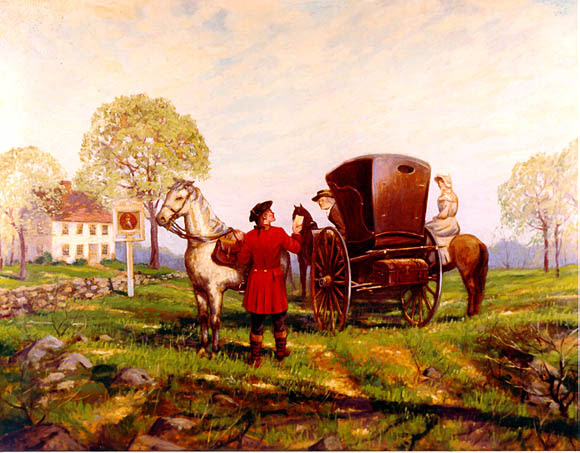 (The thumbnail above is Carl Rakeman’s vision of the Boston Post Road in 1763, painted for the Bureau of Public Roads sometime between 1921 and 1952. The man in the chaise is supposed to be Benjamin Franklin, the woman on horseback his daughter.)