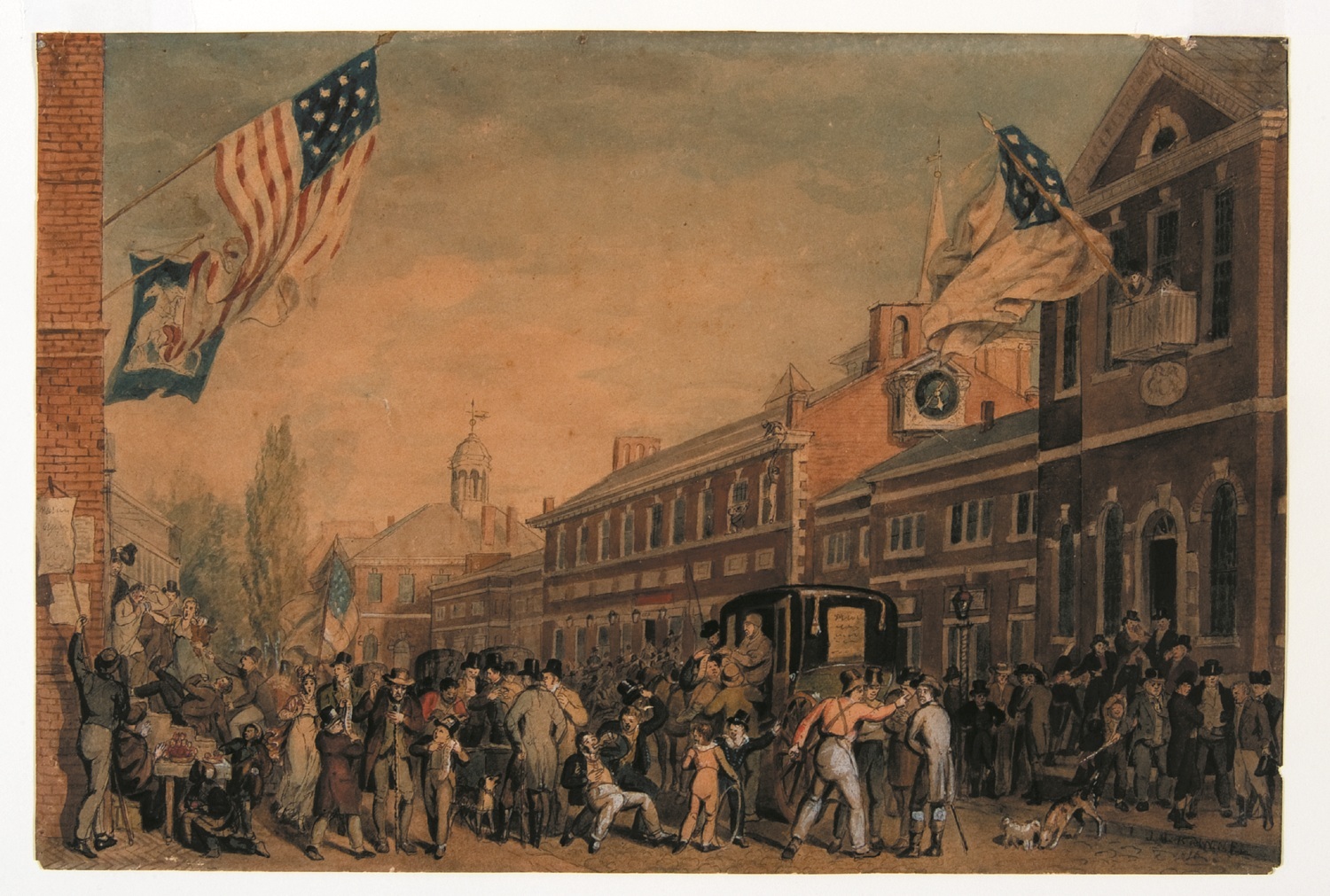 Elections were communal affairs, sometimes with celebratory overtones, sometimes with more ominous overtones. Elections could be held at almost any public venue—from a town hall to a courthouse to a church or tavern. Arriving at the site, electors often confronted a “tumultuous assemblage of men,” as Richard Henry Lee put it, where people milled about—talking, arguing, and sometimes, drinking. In the North, where elections were more sober affairs, women and children might be present, bringing with them “election cakes,” baked especially for the occasion.