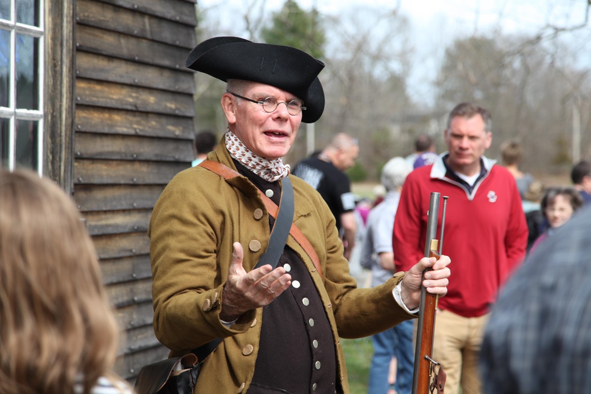 Elm Brook Hill (formerly known as “Bloody Angle”) was the site of a violent ambush against the British column on the afternoon of April 19, 1775. Edmund Foster, a volunteer from Reading, Massachusetts (portrayed by Park Volunteer Ed Hurley, shown above), will lead a tour to this battle site where he fought in 1775. Learn about this action from the words of one who was there! Ed will also be accompanied by local historian and author Don Hafner of the Lincoln Minute Men.That tour will happen twice, at noon and 1:15 P.M. The walk is less than a half mile along a hard-packed dirt surface.