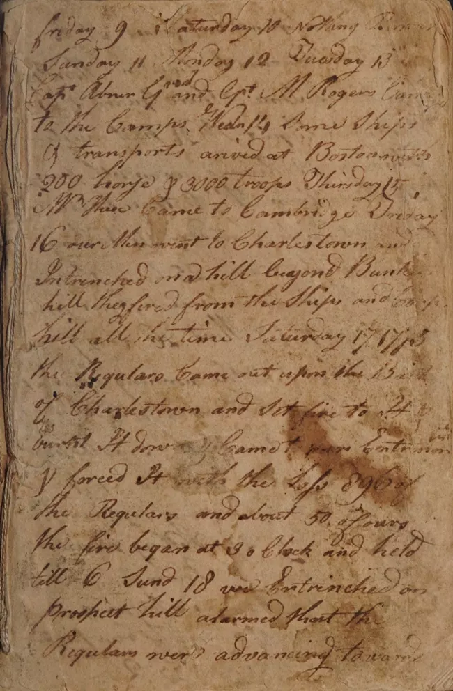 Cpl. Sleeper’s surviving pages start right before the Bunker Hill battle, which his regiment wasn’t involved in. Here’s his terse account of those days:
